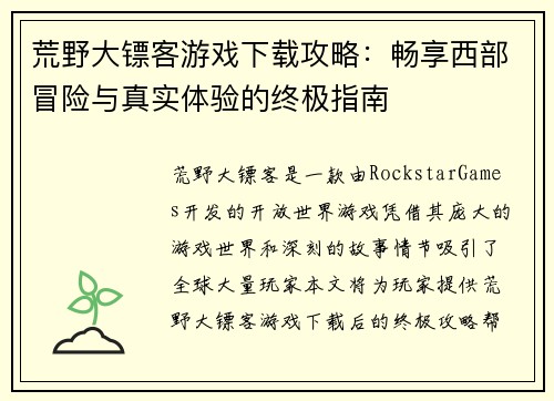 荒野大镖客游戏下载攻略:畅享西部冒险与真实体验的终极指南