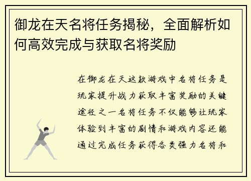 御龙在天名将任务揭秘,全面解析如何高效完成与获取名将奖励